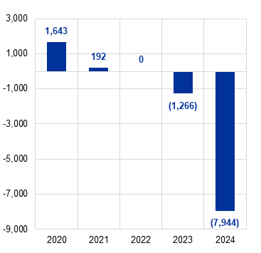 The ECB’s loss for 2024 was €7,944 million, compared with a loss of €1,266 million in 2023 after the full release of the provision for financial risks. Following a decision by the Governing Council, this loss will be carried forward on the ECB’s balance sheet and offset against future profits.