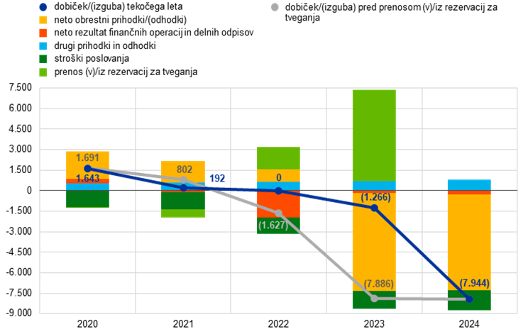 Izguba ECB za leto 2024 je znašala 7.944 milijonov EUR, medtem ko je v letu 2023 izguba po sprostitvi rezervacije za finančna tveganja znašala 1.266 milijonov EUR. Po sklepu Sveta ECB bo izguba prenesena v bilanco stanja ECB in bo pokrita s prihodnjimi dobički.