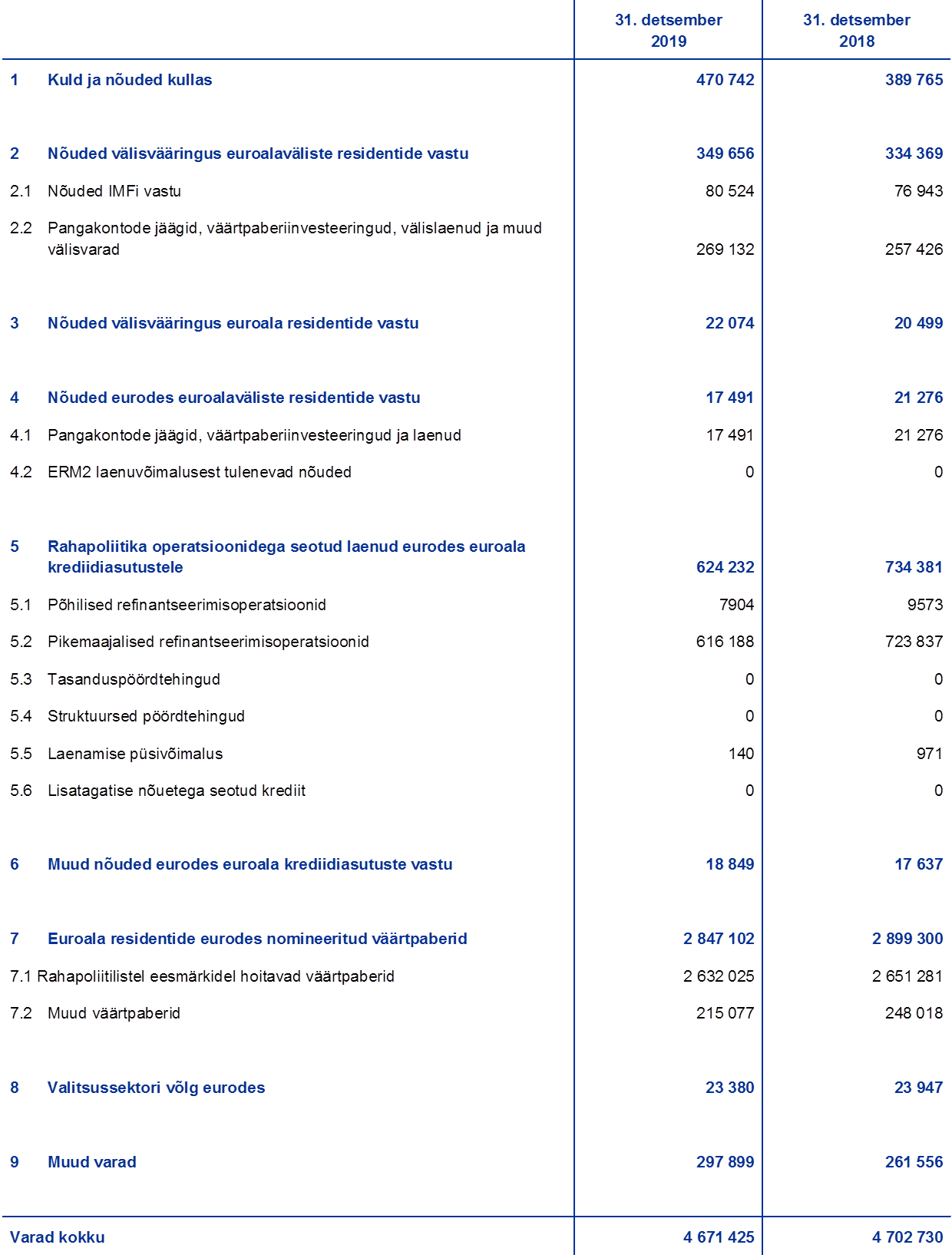 Eurosüsteemi konsolideeritud bilanss seisuga 31. detsember 2019