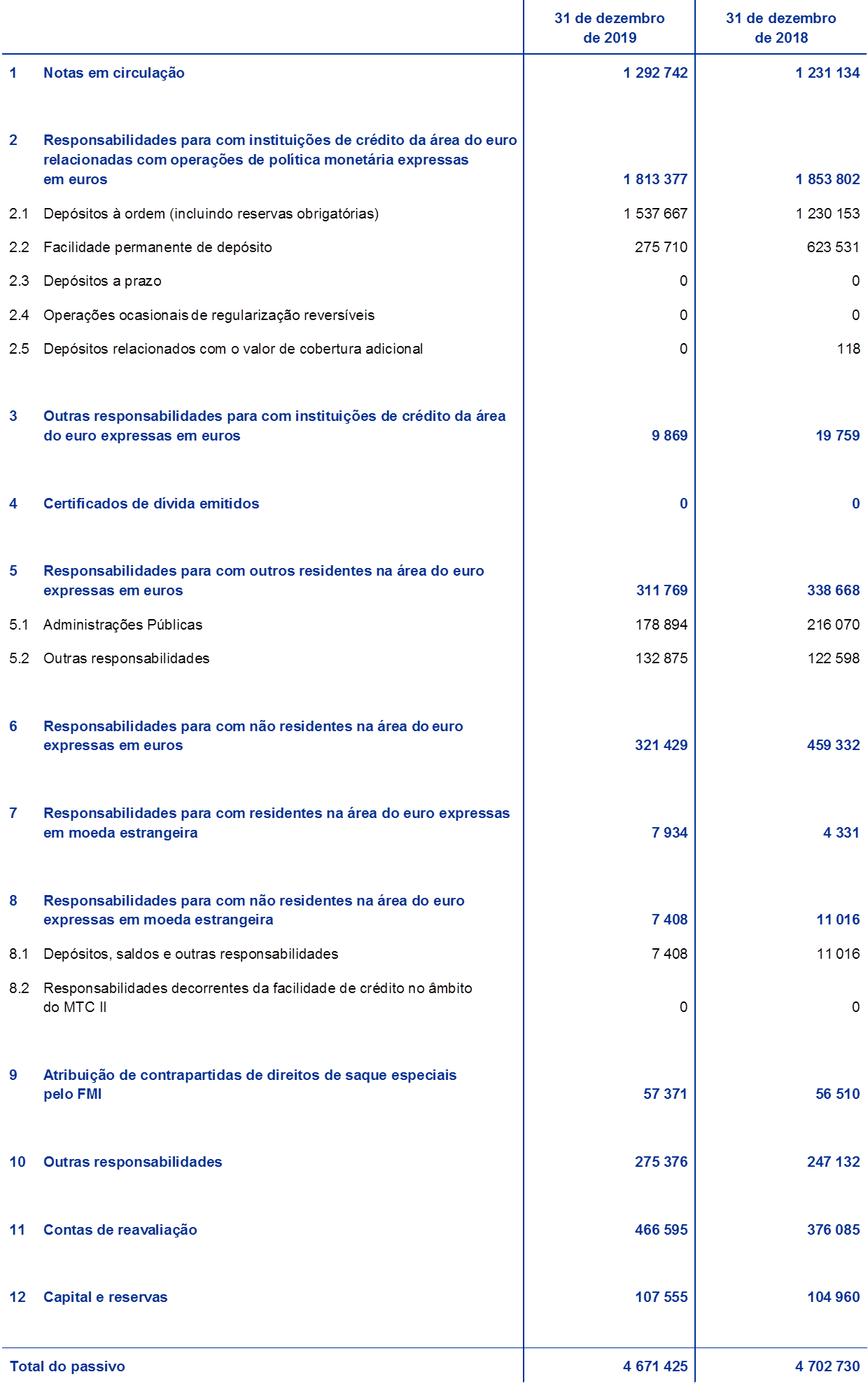 Balanço consolidado do Eurosistema em 31 de dezembro de 2019