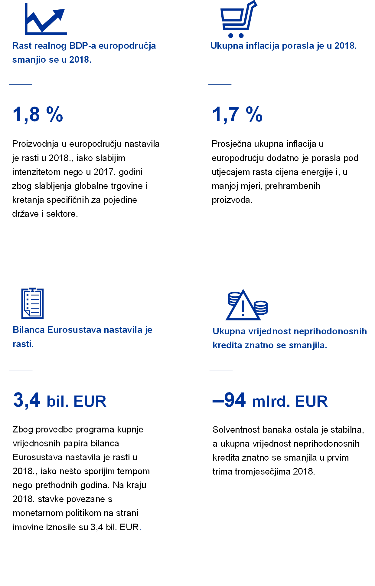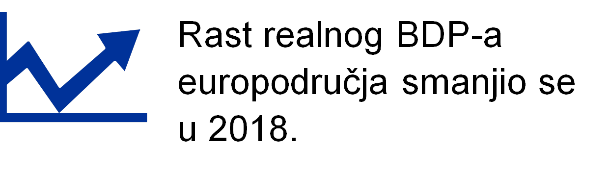 Premda se u 2018. nastavio gospodarski rast u europodručju, oslabio je zamah rasta. Rast se usporio s 2,5 % u 2017. na 1,8 % u 2018. zbog pojave niza nepovoljnih čimbenika tijekom godine. Na vanjski sektor, posebno sektor prerađivačke industrije, nepovoljno je utjecalo znatno slabljenje svjetske trgovine te više čimbenika koji su specifični za pojedine države i sektore.