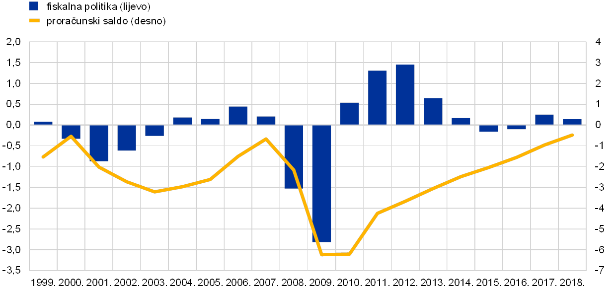 Udio proračunskog manjka opće države u europodručju nastavio se smanjivati u 2018. i pao je na 0,6 % BDP‑a, razinu rijetko zabilježenu od stvaranja ekonomske i monetarne unije (EMU) 1999. (vidi Grafikon 7.). Kao i u prethodnih nekoliko godina, pad ukupnog manjka uvelike je bio rezultat povoljnih cikličkih kretanja, praćenih smanjenjem kamatnih rashoda jer je dug s visokim troškovima koji je dospijevao na naplatu i nadalje bio zamjenjivan novim dugom po nižim kamatnim stopama. Djelovanje fiskalne politike u europodručju[6] bilo je uglavnom neutralno u 2018., iako su agregatni podatci europodručja prikrivali znatne razlike među zemljama jer su veliki izvanredni prihodi u manjem broju zemalja kompenzirali procikličko fiskalno ublažavanje u ranjivim zemljama.