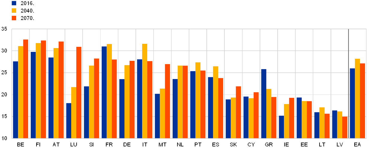 Starenje stanovništva znatno će utjecati na javne financije u sljedećim desetljećima. Javni rashodi povezani sa starenjem u europodručju, koji su iznosili četvrtinu BDP‑a u 2016., već su povišeni po međunarodnim standardima. Izvješće o starenju (engl. Ageing Report) iz 2018. predviđa da će oni dodatno porasti na 28 % BDP‑a u 2040. i da će se malo smanjiti na 27 % BDP‑a do 2070. (vidi Grafikon A).[7] Ukupna slika prikriva velike različitosti među zemljama. Predviđene promjene ukupnih rashoda povezanih sa starenjem kreću se od porasta od 12,9 postotnih bodova BDP‑a u Luksemburgu do pada od 6,4 postotna boda BDP‑a u Grčkoj u razdoblju od 2016. do 2070.[8] Ako se povećanja rashoda povezanih sa starenjem ne riješe, ti rashodi porast će na vrlo velike iznose u srednjoročnom i dugoročnom razdoblju. To bi bio izazov za fiskalnu održivost već u srednjoročnom razdoblju, posebice u zemljama koje već danas imaju visoke razine javnog duga (vidi Grafikon B). Ipak, u nekoliko se zemalja, posebice u Francuskoj, Italiji i Španjolskoj, predviđa da će se troškovni pritisci povezani sa starenjem smanjiti sa svoje najviše razine u srednjoročnom razdoblju do 2070. (vidi Grafikon A).