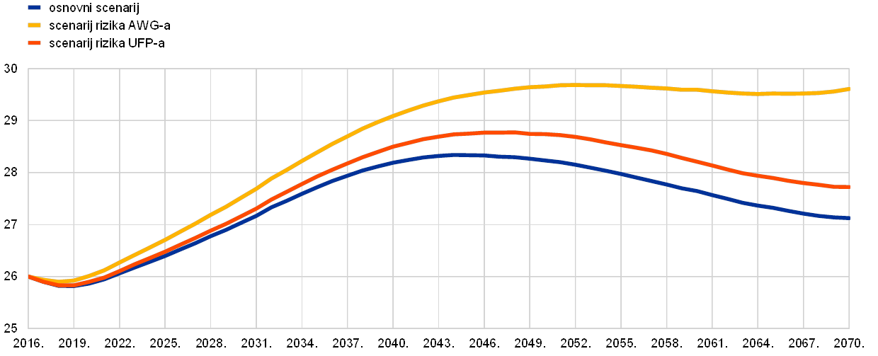 Napomene: Scenarij rizika UFP‑a pretpostavlja konvergenciju prema nižoj stopi rasta UFP‑a do 2070. (tj. na 0,8 % umjesto na 1 %). Scenarij rizika Radne skupine za starenje stanovništva (AWG) pretpostavlja veću dohodovnu elastičnost potrošnje na zdravstvenu zaštitu (zbog veće upotrebe skupe medicinske tehnologije) i više troškove dugotrajne skrbi (zbog povećanog obuhvata primatelja dugotrajne skrbi i konvergencije naviše realnoga životnog standarda).