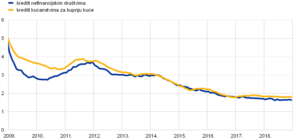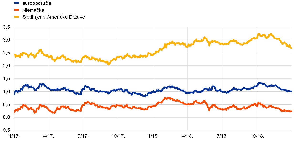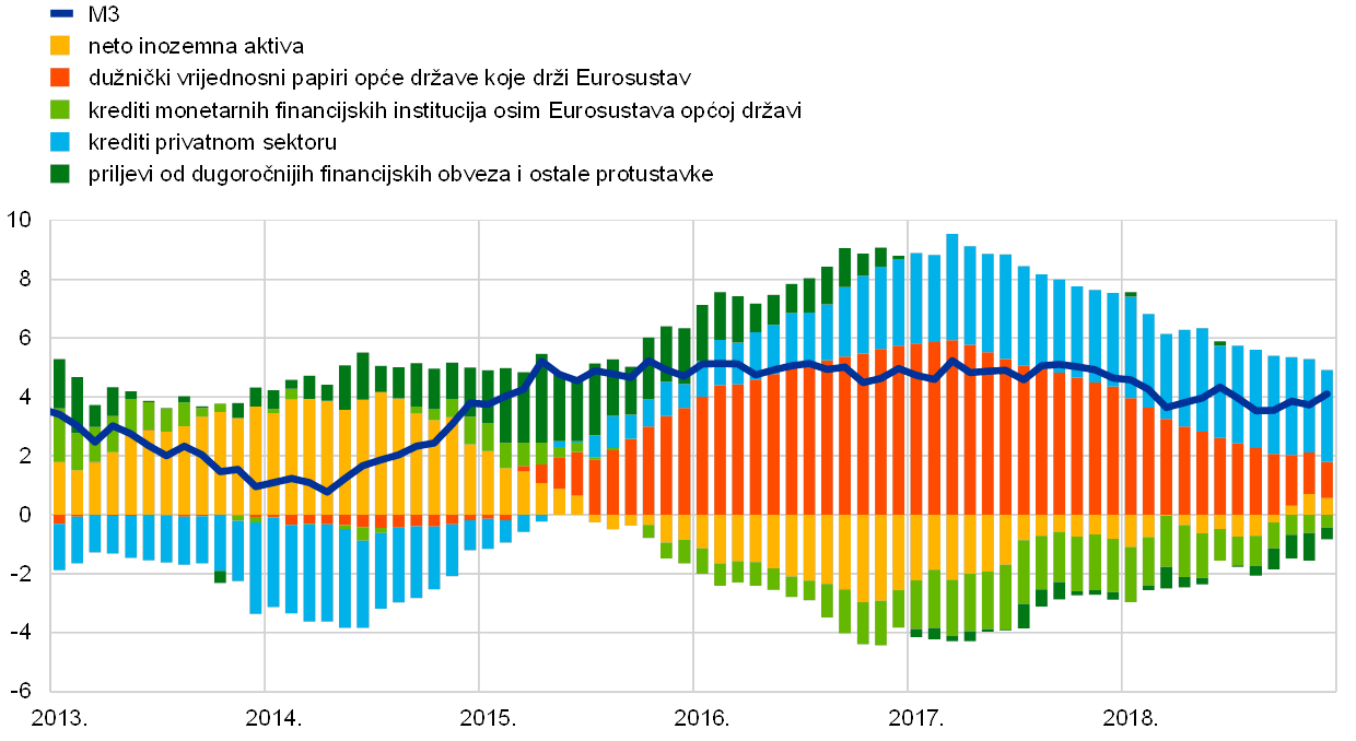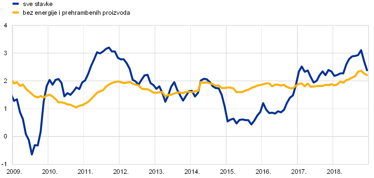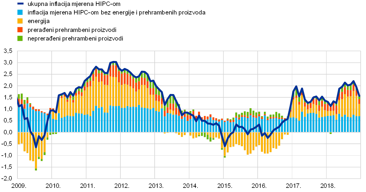 Nakon iznimno snažne dinamike rasta u 2017., gospodarska ekspanzija u europodručju nastavila se u 2018., premda umjerenijom dinamikom, jer je inozemna potražnja oslabjela, a neki činitelji specifični za pojedine zemlje i sektore nepovoljno su djelovali na rast. Istodobno su temeljni pokretači domaće potražnje ostali prisutni. Daljnja poboljšavanja na tržištima rada podupirala su privatnu potrošnju, a poslovnim ulaganjima i nadalje su pogodovali povoljni uvjeti financiranja i jačanje bilanca. Kontinuirana ekspanzija i pooštravanje uvjeta na tržištima rada također su utjecali na daljnje jačanje i širenje domaćih troškovnih pritisaka. Mjere temeljne inflacije i nadalje su bile općenito prigušene. Ipak, kada je riječ o nadolazećem razdoblju, očekuje se da će temeljna inflacija porasti u srednjoročnom razdoblju, poduprta mjerama monetarne politike ESB‑a, kontinuiranom gospodarskom ekspanzijom i jačim rastom plaća.