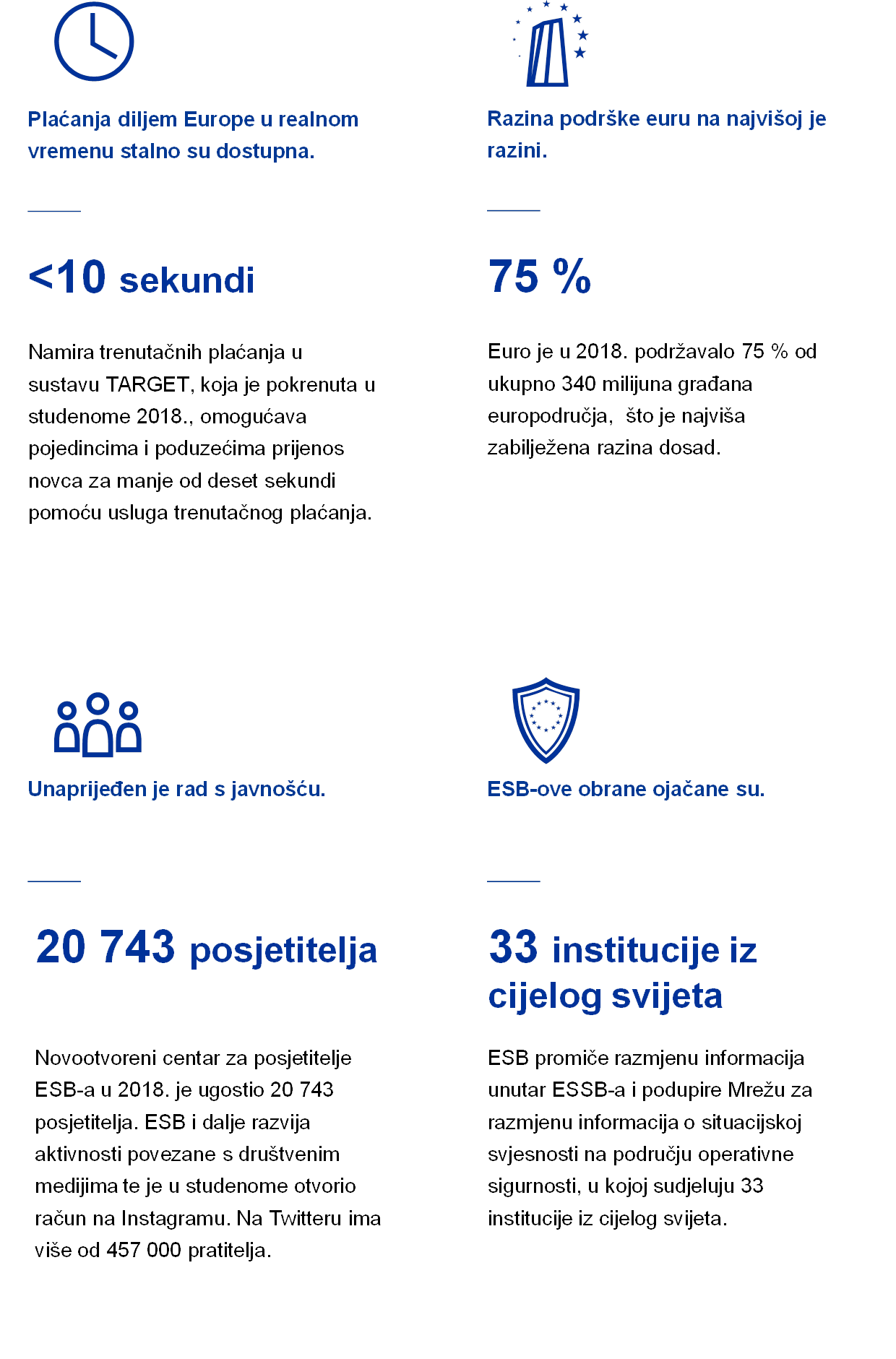 Rezultati Eurobarometra iz prosinca pokazuju da je potpora euru u 2018. porasla na 75 %. ESB je i dalje ulagao napore u povezivanje s građanima europodručja te unaprjeđenje odgovornosti i transparentnosti: surađivao je s Europskim parlamentom, proširio je Dijalog ESB-a s mladima te pozivao na upotrebu ESB-ovih mrežnih stranica, društvenih mreža i centra za posjetitelje.