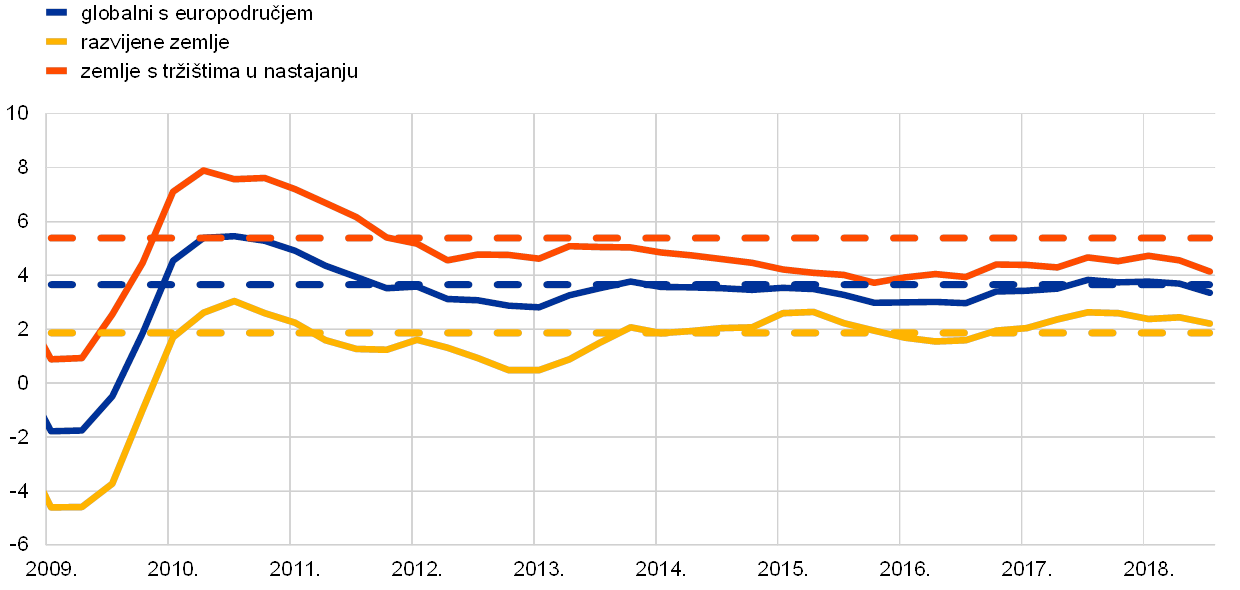 Globalna gospodarska ekspanzija nastavljena je u prva tri tromjesečja 2018. postojanim tempom od 3,6 %, odnosno po stopi sličnoj onoj iz 2017. i blizu svojega dugoročnog prosjeka (vidi Grafikon 1.). Ipak, u usporedbi s prethodnim godinama, porast gospodarske aktivnosti postao je neujednačeniji i slabije sinkroniziran među zemljama. Rast je ostao snažan u Sjedinjenim Američkim Državama, a posustao je u nekoliko drugih zemalja, uključujući Japan i nekoliko zemalja s tržištima u nastajanju, posebice Tursku i Argentinu. Aktivnost se usporila i u Kini u drugom polugodištu. Promatraju li se različite komponente, rast industrijske proizvodnje i svjetske trgovine oslabio je, a rast privatne potrošnje ostao je dobar.