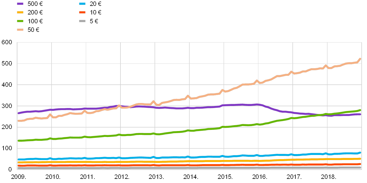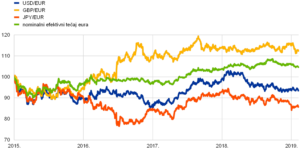 Nominalni efektivni tečaj eura jačao je od početka 2018. (vidi Grafikon 3.). Bilateralni tečaj eura oslabio je u odnosu na druge važne valute. Deprecijacija eura bila je posebice izražena u odnosu na američki dolar, japanski jen i – u manjoj mjeri – švicarski franak. Euro je istodobno znatno ojačao u odnosu na većinu valuta zemalja s tržištima u nastajanju, posebice u odnosu na kineski juan renminbi i, zbog domaćih pritisaka, tursku liru i argentinski pezo.