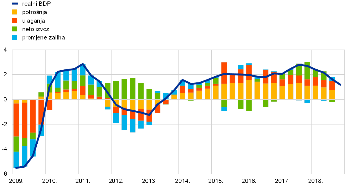 Nakon iznimno snažne dinamike rasta u 2017., rast realnog BDP‑a u europodručju smanjio se na 1,8 % u 2018. (vidi Grafikon 4.). Iako se ovo usporavanje uvelike može pripisati slabljenju globalne trgovine, na njega su utjecali i drugi činitelji, koji su više privremene naravi. U prvoj polovini 2018. poremećaji povezani s vremenskim uvjetima i sindikalno djelovanje, posebice u prometnom sektoru, utjecali su na proizvodnju u nekoliko zemalja. U drugoj polovini godine, a posebice u trećem tromjesečju, došlo je do znatnih poremećaja u proizvodnji automobila nakon što je 1. rujna uveden Globalno usklađeni ispitni postupak za laka vozila. Nadalje, usporavanje rasta možda je produbljeno zbog porasta političke neizvjesnosti, posebice u vezi s mogućim porastom protekcionizma.
