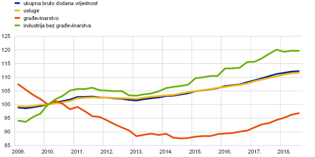 Porast proizvodnje u 2018. nastavio je zahvaćati većinu gospodarskih sektora (vidi Grafikon 5.). Ukupna bruto dodana vrijednost dodatno je porasla, za oko 2 %, odnosno malo manje nego u 2017., ali blizu stopa rasta zabilježenih u 2015. i 2016. U 2018. i dodana vrijednost industrije (bez građevinarstva) i dodana vrijednost sektora usluga porasle su za oko 2 %. Istodobno se dodana vrijednost građevinarstva, premda još niža od pretkrizne razine, nastavila povećavati, i porasla je za oko 4 %. To je ponovo potvrdilo da se sektor građevinarstva sve više oporavlja nakon dugotrajnog razdoblja smanjivanja ili sporog rasta započetog nakon izbijanja financijske krize u 2008.