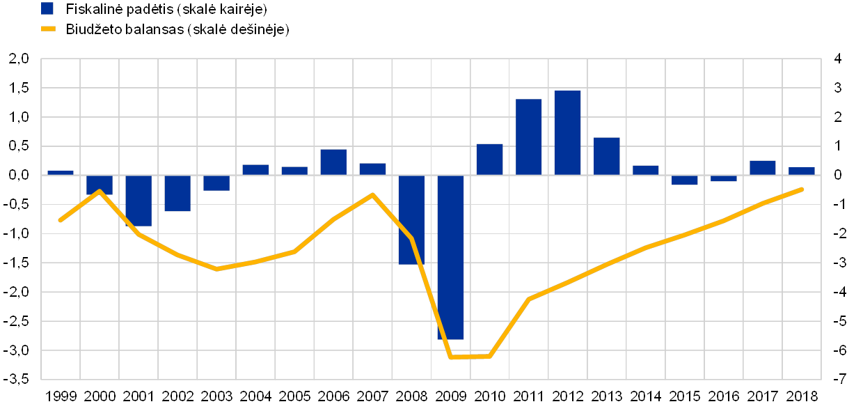 2018 m. euro zonos šalių valdžios sektoriaus deficito rodiklis toliau mažėjo ir sudarė 0,6 % BVP. Toks lygis nebuvo dažnai fiksuotas nuo ekonominės ir pinigų sąjungos (EPS) sukūrimo 1999 m. (žr. 7 pav.). Kaip ir pastaruosius keletą metų, deficito mažėjimą daugiausia lėmė palanki ciklinė ekonomikos padėtis ir mažėjančios palūkanų išlaidos, nes paskolos, kurių skolos tvarkymo išlaidos yra didelės, tebebuvo refinansuojamos naujomis paskolomis mažesnėmis palūkanų normomis. Fiskalinės politikos pozicija euro zonoje[6] 2018 m. iš esmės buvo neutrali, nors euro zonos bendras rodiklis slepia reikšmingus skirtumus tarp šalių (keliose šalyse netikėtai gautos pajamos atsvėrė prociklinį fiskalinės politikos laisvėjimą pažeidžiamose šalyse).