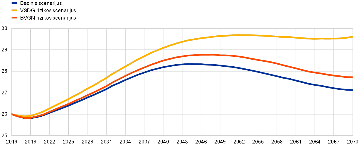 Pastabos: pagal BVGN rizikos scenarijų numatoma, kad iki 2070 m. BVGN ims augti lėčiau (augimas sudarys 0,8 % vietoj 1 %). Pagal VSDG parengtą rizikos scenarijų numatoma, kad tiek pajamų elastingumas sveikatos priežiūros išlaidų atžvilgiu (dėl dažniau naudojamos brangios medicininės įrangos), tiek ir ilgalaikės priežiūros išlaidos (dėl didesnės kompensacijos gaunantiesiems ilgalaikės priežiūros paslaugas ir gerėjančio pragyvenimo lygio) bus didesni.