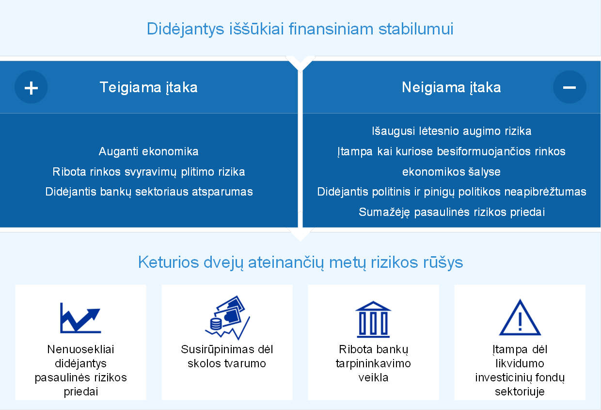 Nors pasaulio ekonomika toliau augo stabiliu tempu, rizika ir neapibrėžtumas vis labiau prastino ekonomikos perspektyvas. Neapibrėžtumas dėl prekybos ypač padidėjo dėl JAV administracijos veiksmų ir jos partnerių atsako. Įtampa pasiekė aukščiausią tašką, kai vasarą JAV administracija paskelbė, kad pradeda taikyti tarifus 250 mlrd. JAV dolerių vertės iš Kinijos importuotoms prekėms. Savo ruožtu Kinija pranešė, kad taikys tarifus 110 mlrd. JAV dolerių vertės iš JAV importuotoms prekėms. Be to, abejonės dėl Brexito taip pat neigiamai veikė prekybos perspektyvas. Nors tarifų padidėjimo pasaulinis poveikis ir toliau turėtų būti ribotas, šie protekcionistiniai grasinimai gali sumažinti pasitikėjimą, sutrikdyti pasaulines vertės grandines ir neigiamai paveikti investicijas, o dėl to gali didėti rizika, kad pasaulio ekonomikos perspektyvos prastės. Jau metų pabaigoje buvo ženklų, kad neapibrėžtumas dėl prekybos pradėjo daryti poveikį verslui. Jei paaštrės prekybiniai ginčai, tai gali turėti reikšmingą poveikį pasauliniam augimui.