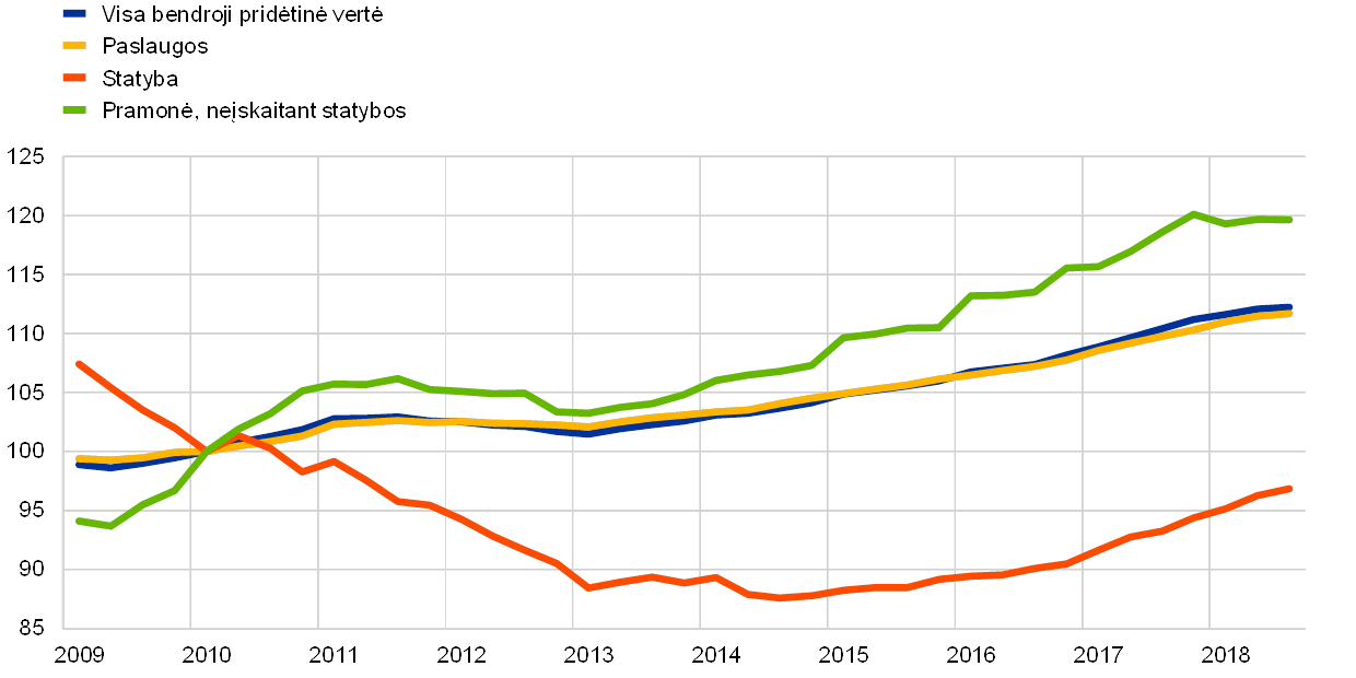 2018 m. tebeaugo daugelio ekonomikos sektorių gamybos apimtis (žr. 5 pav.). Visa bendroji pridėtinė vertė toliau didėjo (maždaug 2 %). Vis dėlto toks augimo tempas buvo šiek tiek mažesnis nei praėjusiais metais, tačiau panašus kaip 2015 ir 2016 m. Tiek pramonės (neįskaitant statybos), tiek ir paslaugų sektoriaus sukuriama pridėtinė vertė 2018 m. padidėjo maždaug 2 %. Nors vis dar mažesnė negu iki krizės, statybos sektoriuje sukurta pridėtinė vertė toliau didėjo (maždaug 4 %). Tai tik patvirtina, kad statybų sektorius vis labiau atsigauna po užsitęsusio nuosmukio ar lėto augimo laikotarpio, prasidėjusio 2008 m. finansų krizės pradžioje.
