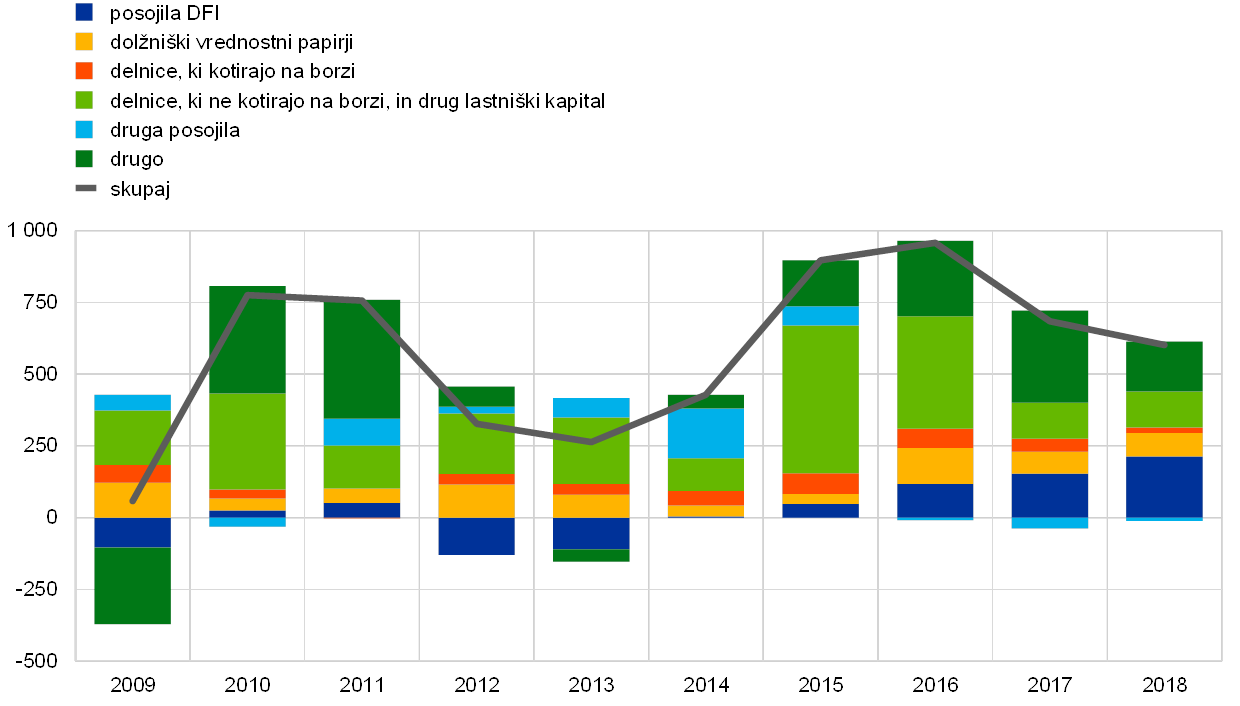 V letu 2018 so podjetniške naložbe v euroobmočju še naprej spodbujali rast domačega povpraševanja, ugodni pogoji financiranja in dobičkonosnost podjetij. Naložbe so se povečale tudi v sektorjih, ki se spopadajo z omejenimi zmogljivostmi, na primer v prevoznem sektorju. Vendar pa sta na naložbeno aktivnost podjetij, zlasti tistih, ki so bolj izpostavljena zunanjemu okolju, vplivala manj dinamično zunanje okolje in večja svetovna negotovost, zlasti glede trgovinske politike. V prihodnje se bo rast podjetniških naložb verjetno umirila zaradi manj ugodnega zunanjega okolja in zmernejšega končnega povpraševanja ter pričakovanega postopnega zaostrovanja pogojev financiranja.