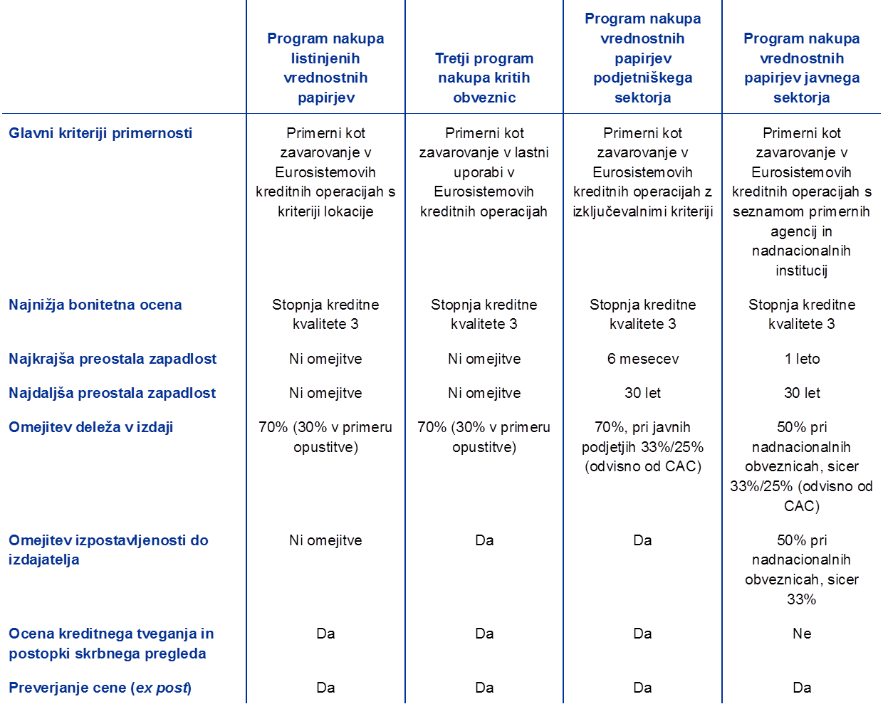 - V okviru programa nakupa vrednostnih papirjev javnega sektorja je najkrajša preostala zapadlost eno leto, najdaljša preostala zapadlost pa 30 let. V okviru programa nakupa vrednostnih papirjev podjetniškega sektorja je najkrajša preostala zapadlost šest mesecev, najdaljša preostala zapadlost pa 30 let.