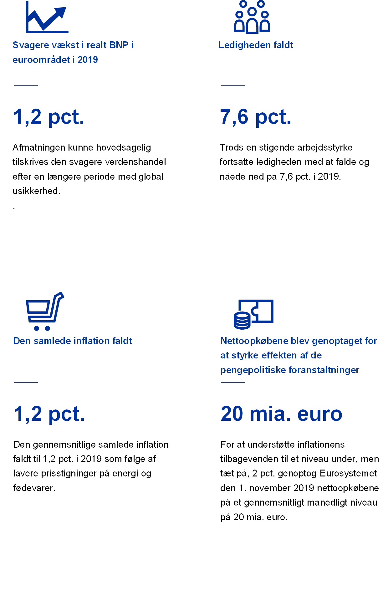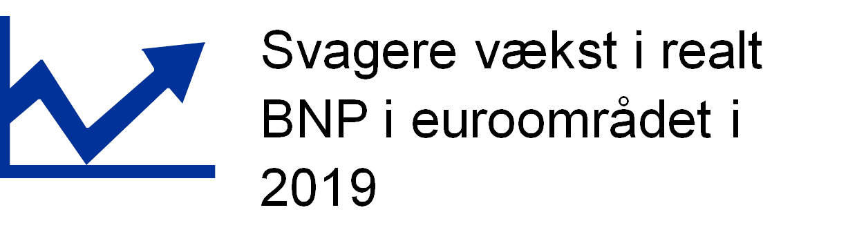 Den økonomiske vækst i euroområdet aftog yderligere i 2019, fra 1,9 pct. året før til 1,2 pct. Den fortsatte vækst blev understøttet af gunstige finansieringsforhold, yderligere fremgang i beskæftigelsen og en marginalt ekspansiv finanspolitik, selv om usikkerhed i tilknytning til verdenshandlen påvirkede især fremstillingssektoren og investeringerne negativt.