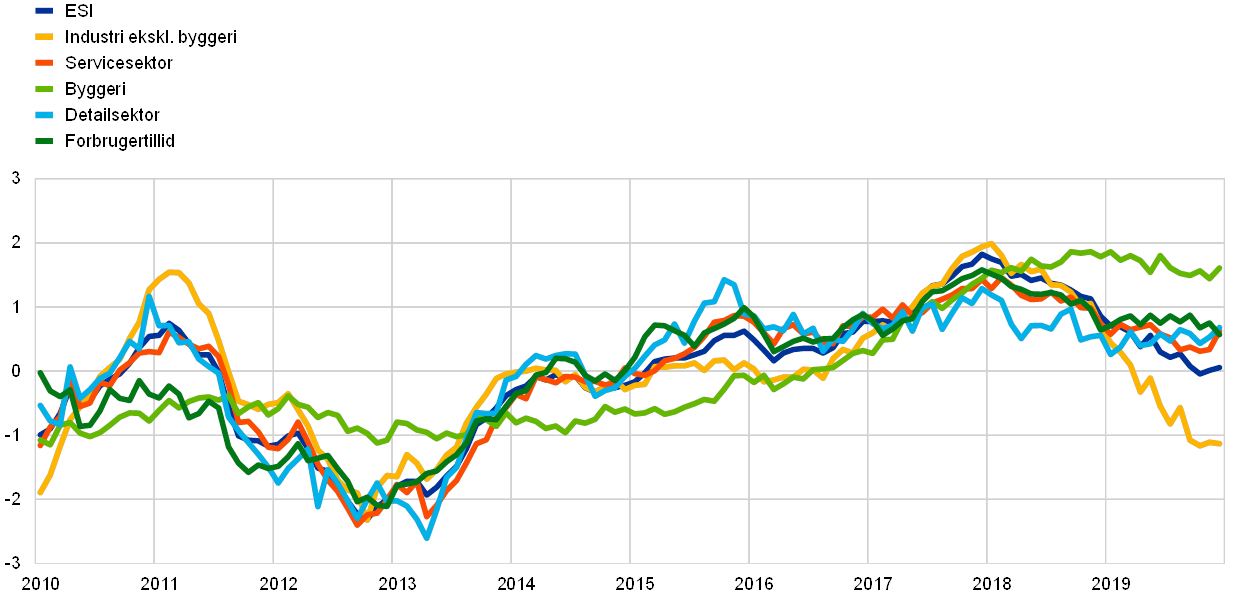 Den økonomiske nedgang i 2019 afspejlede navnlig en svagere verdenshandel samt øget global usikkerhed, som igen primært gik ud over industrien i euroområdet. Samtidig var service- og detailsektoren fortsat robust trods en vis nedgang. Det fremgår af figur A, som viser tillidsindikatorer for forskellige sektorer i euroområdets økonomi. Kommissionens indikator for økonomiske forventninger (Economic Sentiment Indicator (ESI)) er et vægtet gennemsnit af tilliden i industrien ekskl. byggeriet (med en vægt på 40 pct.), servicesektoren (30 pct.), byggeriet (5 pct.), detailsektoren (5 pct.) og husholdningerne (20 pct.). Det fremgår, at nedgangen er langt mindre markant i de mere indenlandsk orienterede sektorer (dvs. byggeriet, servicesektoren, detailsektoren og husholdningerne) end i industrien.