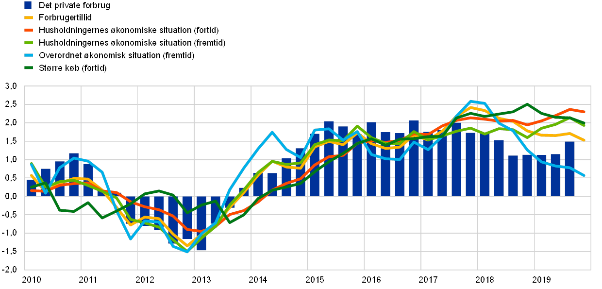 I 2019 forblev service- og detailsektoren samlet set robust i en situation med aftagende økonomisk vækst i euroområdet, selv om der også sås en vis afdæmpning af væksten i disse sektorer. Det private forbrug udgør en vigtig del af efterspørgslen i service- og detailsektoren. Med dette for øje indeholder denne boks en nærmere beskrivelse af forbrugertilliden i euroområdet, herunder årsagerne til forbrugets relative robusthed.