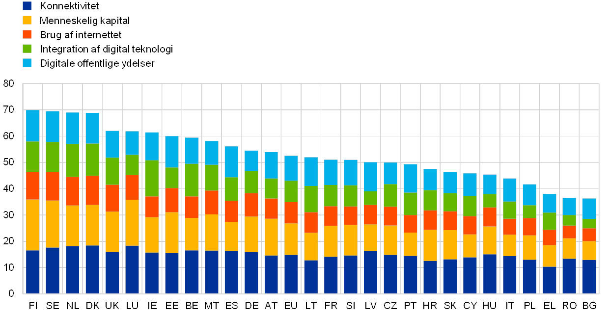 Ifølge litteraturen påvirker digitaliseringen en række økonomiske nøglevariabler, der har relevans for pengepolitikken. Empirien vedrørende digitaliseringens virkninger tyder på, at digitaliseringen kan bidrage til produktivitets- og aktivitetsvæksten, mens dens samlede effekt på inflationen endnu ikke er afklaret.[9] Ifølge Europa-Kommissionens indeks for den digitale økonomi og det digitale samfund Digital Economy and Society Index (DESI) spændte digitaliseringsgraden for økonomierne i EU i 2019 fra omkring 40 for de mindst digitale til omkring 70 for de mest digitale økonomier (se figur 8). Mens EU's økonomier havde omtrent samme score for konnektivitet, var der større forskelle med hensyn til menneskelig kapital, brug af internettet, integration af digital teknologi og digitale offentlige ydelser.
