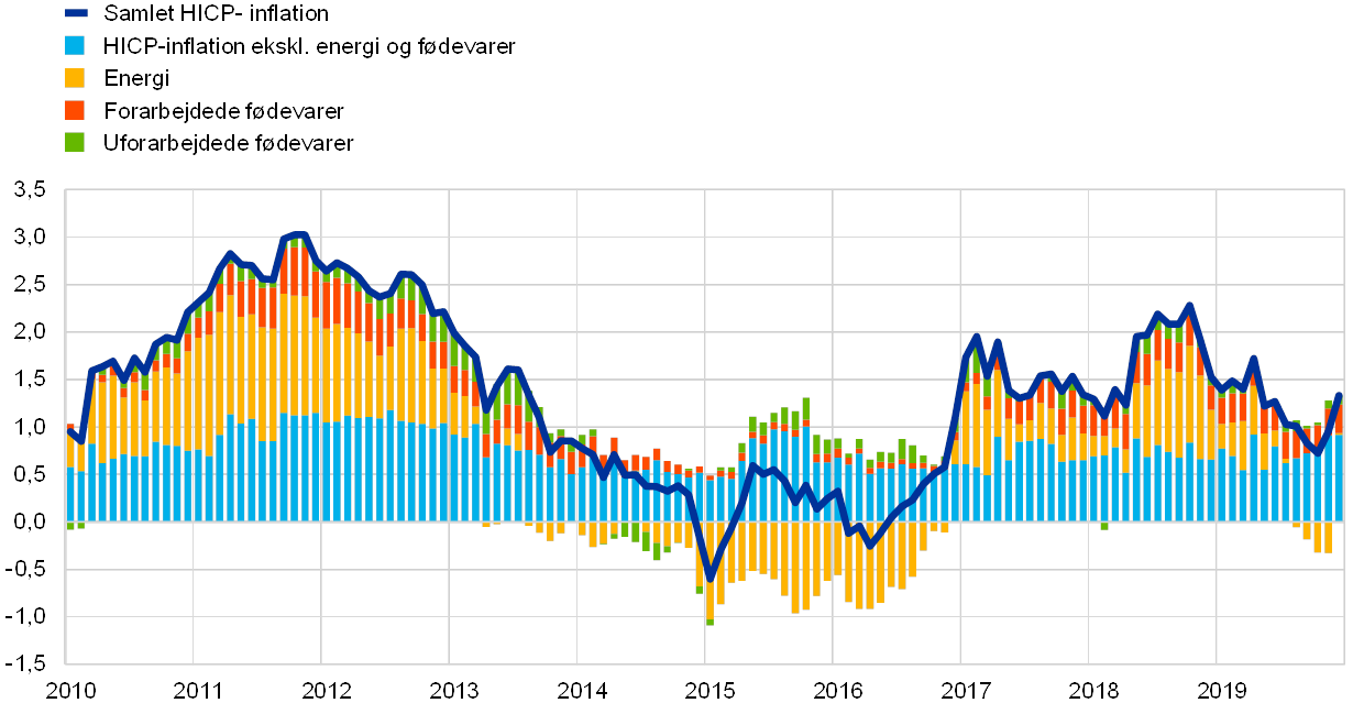Inflationen i euroområdet faldt fra 1,8 pct. i 2018 til 1,2 pct. i 2019. Faldet skyldtes et lavere bidrag fra de to mere volatile komponenter energi og fødevarer. Uden disse to komponenter var inflationen i gennemsnit 1,0 pct. i 2019, hvilket var det samme som i de to foregående år.