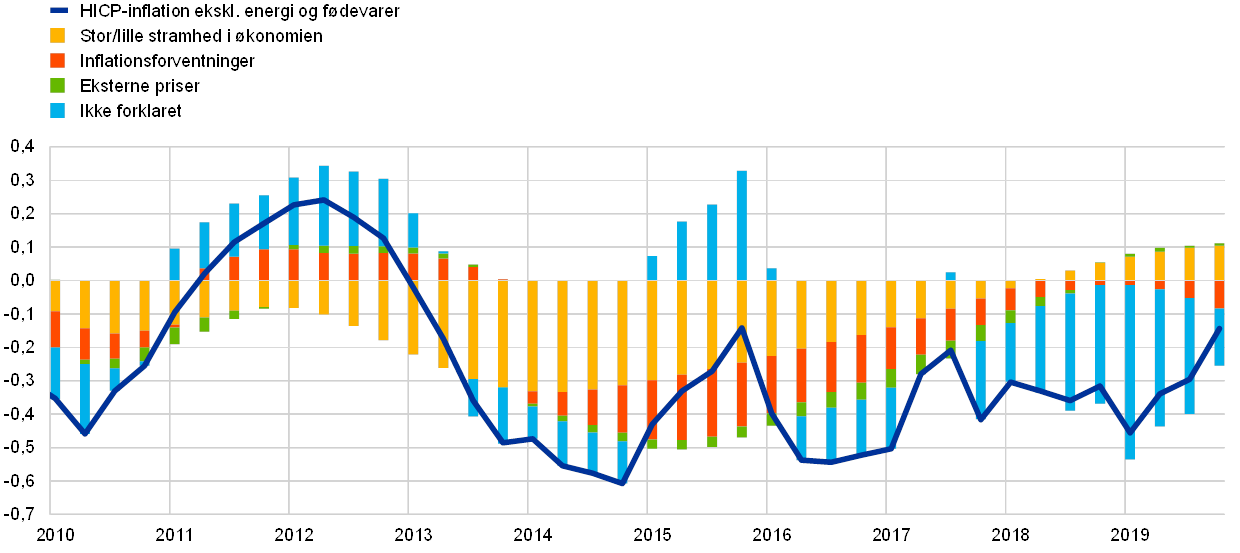 - Se E. Bobeica og A. Sokol, "Drivers of underlying inflation in the euro area over time: a Phillips curve perspective", Economic Bulletin, 4. udgave, ECB, 2019. Denne analyse fokuserer på en "in-sample"-dekomponering af inflationen. En senere analyse af prognoseresultaterne med denne modeltype samt forudsigelseskraften for forskellige typer af inflationsvariable kan findes i L. Moretti, L. Onorante og S. Zakipour Saber, "Phillips curves in the euro area", Working Paper Series, nr. 2295, ECB, juli 2019.