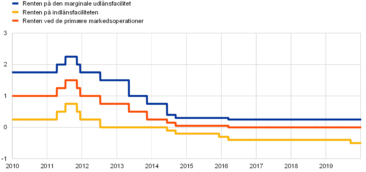 På den baggrund lempede Styrelsesrådet pengepolitikken yderligere i 2019. Dette skete i tre omgange og omfattede en ny serie målrettede langfristede markedsoperationer, en forlængelse af vores forward guidance, en nedsættelse af renten på vores indlånsfacilitet og genoptagelsen af vores opkøbsprogram. Ved udgangen af 2019 var der begyndende tegn på en stabilisering af væksten og en svag stigning i den underliggende inflation.