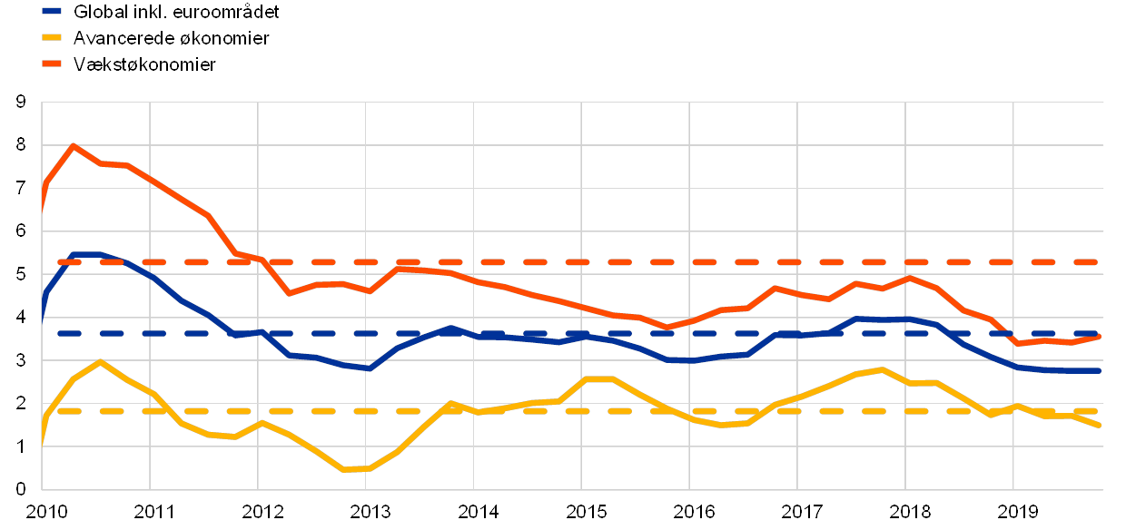 Den globale økonomiske vækst faldt brat i løbet af 2019. Den betydelige nedgang i forhold til toppunktet i midten af 2018 betød, at væksten kom et godt stykke under det historiske gennemsnit og lå på det svageste niveau siden den globale finanskrise (se figur 1). Den globale nedgang var bredt funderet og synkroniseret på tværs af landene. I de store avancerede økonomier som USA, Storbritannien og Japan afspejlede dette et fald fra vækstrater, der lå højere end gennemsnittet. I Kina aftog væksten til det laveste niveau siden 1990 og lå omkring den aktuelt estimerede potentielle vækst. På tværs af de andre store vækstøkonomier var væksten generelt træg, hvilket delvis kan tilskrives et langsomt opsving efter de seneste recessioner.