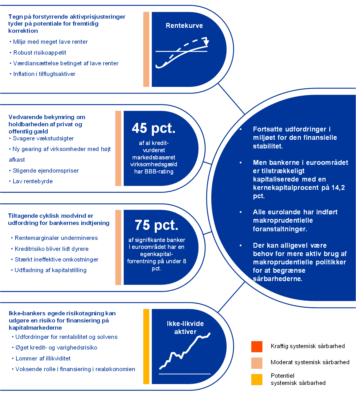 Den strukturelt lave rentabilitet er stadig en udfordring for bankerne i euroområdet, selv om kapitalgrundlaget i sektoren – med en egentlig kernekapitalprocent på 14,2 pct. – er tilstrækkelig. I 2019 var en udpræget risikovillighed på de finansielle markeder og ejendomsmarkederne fortsat med til at opbygge en række sårbarheder i aktivpriserne, mens risiciene blev stadig større i den voksende finansielle sektor uden for banksektoren. Eurolandene gennemførte i samråd med ECB en række makroprudentielle foranstaltninger for at afbøde og opbygge modstandskraft mod systemiske risici.
