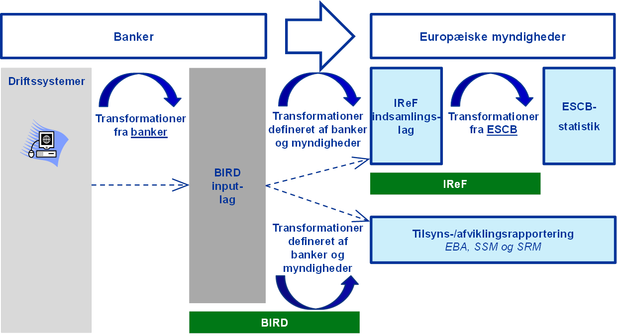 - Her er der primært tale om datasæt vedrørende rapporteringskrav til indskudsinstitutter som angivet i: ECB's statistiske forordninger om monetære finansielle institutioners balanceposter og renter, sektormodulet af forordningen om statistik over beholdninger af værdipapirer og AnaCredit-forordningen om granulære data om kreditter og kreditrisici.