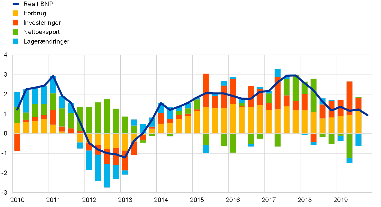 Anm.: Den årlige BNP-vækst for 4. kvt. 2019 vedrører det foreløbige skøn, mens de seneste observationer for komponenterne er for 3. kvt. 2019.