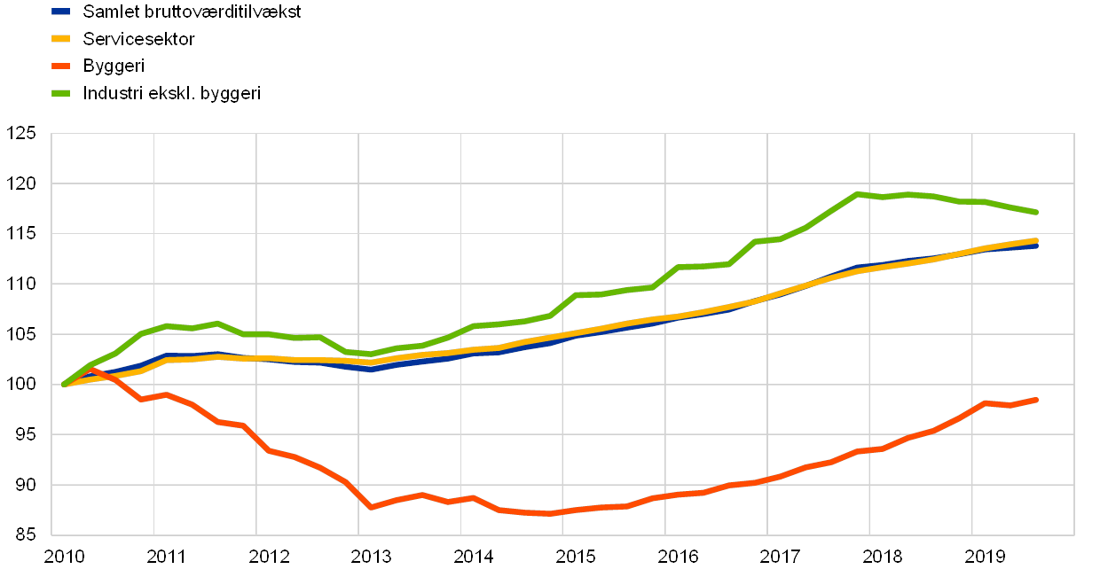 Produktionsvæksten i 2019 var drevet af servicesektoren og byggeriet, som forblev robuste på baggrund af den solide indenlandske efterspørgsel i euroområdet. Aktiviteten i industrien i euroområdet svækkedes yderligere (se figur 6). Det afspejlede en negativ afsmitning fra den svage udenlandske efterspørgsel. Derimod var der kun begrænsede tegn på, at den svagere udenlandske efterspørgsel påvirkede servicesektoren i 2019.[3]