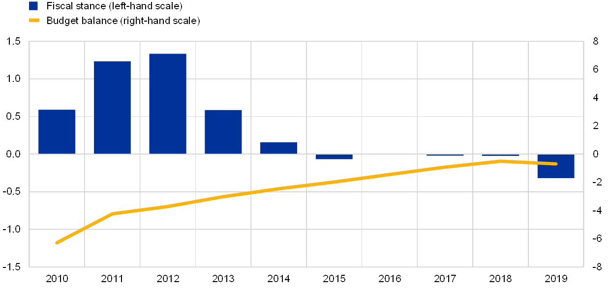 - The fiscal stance reflects the direction and size of the stimulus from fiscal policies to the economy, beyond the automatic reaction of public finances to the business cycle. It is measured as the change in the cyclically adjusted primary balance ratio net of government support to the financial sector. For more information on the concept of the euro area fiscal stance, see the article entitled “The euro area fiscal stance”, Economic Bulletin, Issue 4, ECB, 2016.