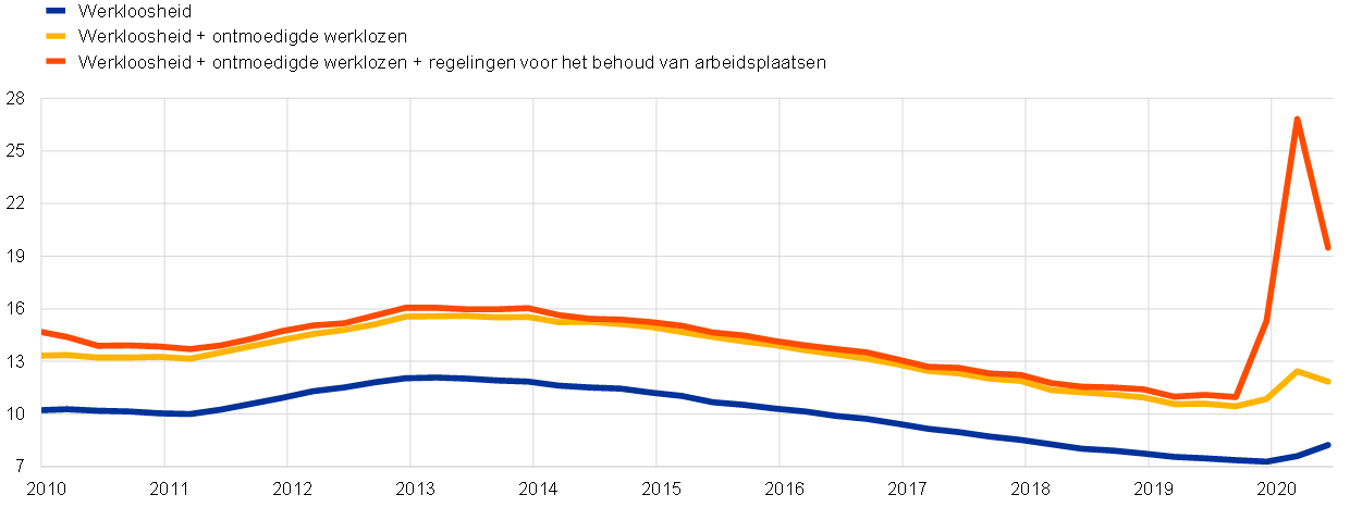 De coronacrisis heeft een grote impact gehad op de arbeidsmarkt in het eurogebied. Het werkloosheidscijfer in het eurogebied (zie de blauwe lijn in Grafiek A) heeft gematigd gereageerd op de krimp van de economische bedrijvigheid en weerspiegelt de effecten van COVID-19 op de arbeidsmarkt niet volledig. Om de mate van onderbenutting van arbeid tijdens de pandemie beter te kunnen meten, kan daarnaast ook gekeken worden naar het aantal inactieve ontmoedigde werklozen (zie de gele lijn in Grafiek A). Bovendien zijn regelingen voor het behoud van arbeidsplaatsen specifiek tijdens deze crisis op brede schaal ingezet. Deze hebben geholpen om banen te beschermen en het inkomen van werknemers ondersteund, maar hebben ook het aantal gewerkte uren doen dalen. In april 2020 maakten zo'n 30 miljoen mensen (ongeveer 19% van de beroepsbevolking) gebruik van een dergelijke regeling voor het behoud van arbeidsplaatsen. Als het standaard werkloosheidspercentage wordt aangevuld met het aantal ontmoedigde werklozen en met het aantal werknemers dat valt onder regelingen voor het behoud van arbeidsplaatsen, ontstaat een representatiever beeld van de mate van onderbenutting van arbeid (zie de rode lijn in Grafiek A).