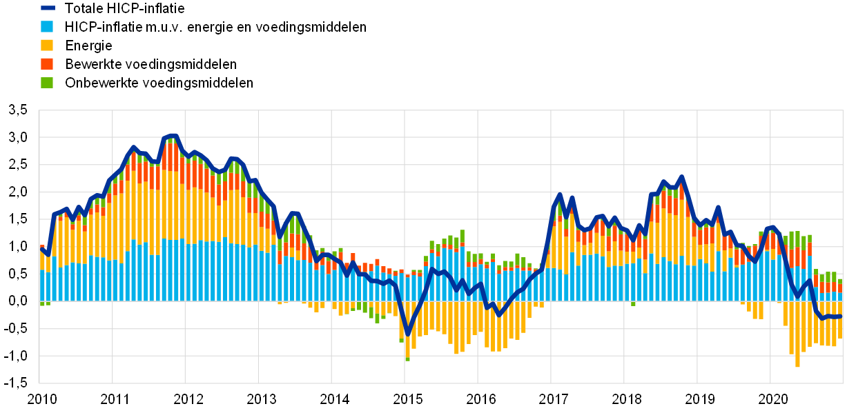 De totale inflatie in het eurogebied bedroeg in 2020 gemiddeld 0,3%, tegen 1,2% in 2019. Wat de componenten van de geharmoniseerde consumptieprijsindex (HICP) betreft, kwam in de daling de lagere bijdrage van de energie-inflatie tot uitdrukking, maar in de tweede helft van het jaar ook die van de HICP-inflatie met uitzondering van energie en voedingsmiddelen (zie Grafiek 9). Het desinflatieproces werd gedreven door de substantiële inkrimpingen van de economische bedrijvigheid, die de consumptieve vraag aanzienlijk verzwakten en grote negatieve risico's voor de economische vooruitzichten met zich meebrachten. Ook waren de economische consequenties van en reacties op de coronapandemie zichtbaar als desinflatiefactoren. Zo was de verdere daling van de inflatie in de tweede helft van het jaar deels het gevolg van de prijsdaling van aan reizen gerelateerde diensten (met name vervoer en hotels), die het hardst geraakt waren door crisis, en van de tijdelijke verlaging van het btw-tarief in Duitsland.