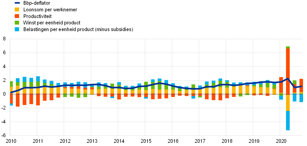 Afgemeten aan de groei van de bbp-deflator liep de binnenlandse prijsdruk tijdens 2020 gemiddeld sneller op dan het gemiddelde niveau in 2019 (zie Grafiek 10). De jaarlijkse groei van de loonsom per werknemer viel daarentegen snel terug in 2020 en kwam gemiddeld uit op -0,6%, ruim onder de waarde van 2019. Tegelijkertijd impliceerde de nog scherpere daling van de productiviteitsgroei een substantiële stijging van de arbeidskosten per eenheid product, wat bijdroeg aan de waargenomen groei van de bbp-deflator. De toename van de arbeidskosten per eenheid product kwam uit op 4,6%, een stijging ten opzichte van de 1,9% in 2019. De toename van de arbeidskosten per eenheid product, de productiviteitsgroei en de loonsom per werknemer werden in 2020 beïnvloed door de grootschalige inzet van arbeidstijdverkortingsregelingen, wat er bijvoorbeeld op wijst dat de werkgelegenheid veel veerkrachtiger bleef dan de productiviteit of het feitelijk aantal gewerkte uren. De statistische vastlegging van deze indicatoren was bovendien problematisch, aangezien ze een ongebruikelijk hoge bijdrage van subsidies aan binnenlandse prijsontwikkelingen suggereerden, en daarmee de vergelijking tussen recente en eerdere ontwikkelingen bemoeilijkten.[13] Aan de uitgavenkant bleken de statistische problemen uit de forse toename in het groeitempo van de overheidsconsumptiedeflator in het tweede kwartaal.