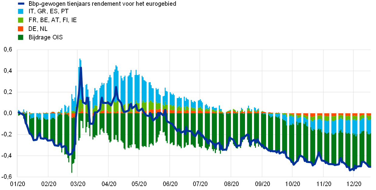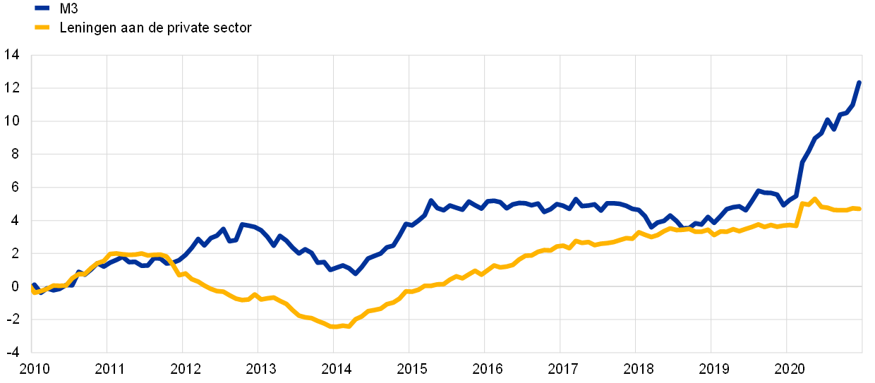 Ook de economie van het eurogebied had sterk te lijden onder de gevolgen van de pandemie. Dit bleek bijvoorbeeld uit de consumptie, die in de eerste helft van het jaar sterk terugliep als gevolg van wijdverbreide lockdownmaatregelen en een verhoogde risicoaversie. De bedrijvigheid nam eveneens aanzienlijk af, met name in de dienstensector, als gevolg van vraaguitval en beperkingen op de bedrijvigheid. Als gevolg daarvan daalde het reële bbp in het tweede kwartaal van 2020 uitzonderlijk snel. De monetaire en budgettaire beleidsmakers hebben echter snel en voortvarend gehandeld om de ineengestorte vraag en de grote onzekerheid aan te pakken, onder andere door te zorgen voor gunstige en stabiele financieringsvoorwaarden en door de toegang tot liquide middelen zeker te stellen. Vanaf het begin van de COVID-19-crisis zijn de verwachtingen over de diepte en de duur van de recessie vooral beïnvloed door de vooruitzichten op een medische oplossing, in het bijzonder een vaccin. In combinatie met de krachtige en gecoördineerde beleidsmaatregelen, leidden positieve berichten aan het einde van het najaar over de voortgang in de ontwikkeling van vaccins tot een geleidelijk vertrouwensherstel. Hoewel de groeiontwikkelingen in de tweede helft van het jaar volatiel bleven als gevolg van de tweede besmettingsgolf, wisten de groeiverwachtingen zich steeds sterker te stabiliseren. De pandemie had ook een grote weerslag op de prijsontwikkelingen. De HICP-inflatie daalde in de loop van het jaar als gevolg van een haperende vraag, lagere olieprijzen en teruggelopen bedrijvigheid, en dook vanaf augustus in de min. Ook andere factoren, zoals de tijdelijke verlaging van het Duitse btw-tarief in de tweede helft van het jaar, hadden een neerwaarts effect op de inflatie. Op basis van de verwachting van een solide herstel in 2021 en het terugdraaien van tijdelijke maatregelen zoals de verlaging van het Duitse btw-tarief nam de verwachting van een stijging van de inflatie echter toe. Dankzij krachtige beleidsmaatregelen bleven de krediet- en financieringsvoorwaarden ondersteunend, waardoor de verkrappende impact op de bancaire kredietverlening als gevolg van de verslechterde risico-omgeving grotendeels teniet werd gedaan. Hoewel de ontwrichting van de markt als gevolg van de pandemie in maart tot een stevige aanscherping van de financieringsvoorwaarden had geleid, droeg voortvarend beleidsoptreden bij aan dalende rendementen op overheidsobligaties in het eurogebied in 2020 en aan een geleidelijk herstel van de aandelenkoersen in het eurogebied in de tweede helft van het jaar, die door de pandemie op een dieptepunt waren beland. De periode van grote onzekerheid leidde ook tot een versnelde geld- en kredietgroei, die duidelijk weerspiegeld werd in de sterke voorkeur van bedrijven en huishoudens voor liquiditeit en de opbouw daarvan.