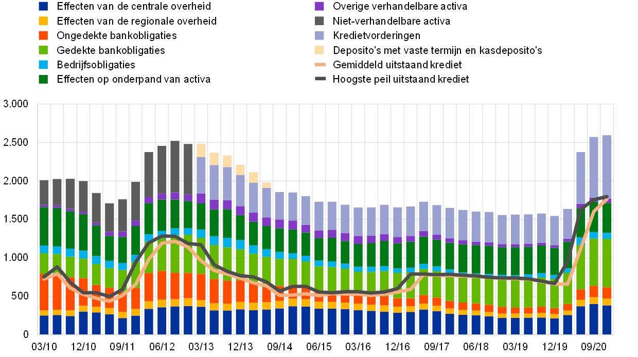 - Het Eurosysteem verstrekte ook liquiditeit als vangnet, eerst in maart via aanvullende LTRO’s en vervolgens in april door van start te gaan met een reeks van zeven langerlopende herfinancieringstransacties in verband met de pandemie (pandemic emergency longer-term refinancing operations - PELTRO’s).