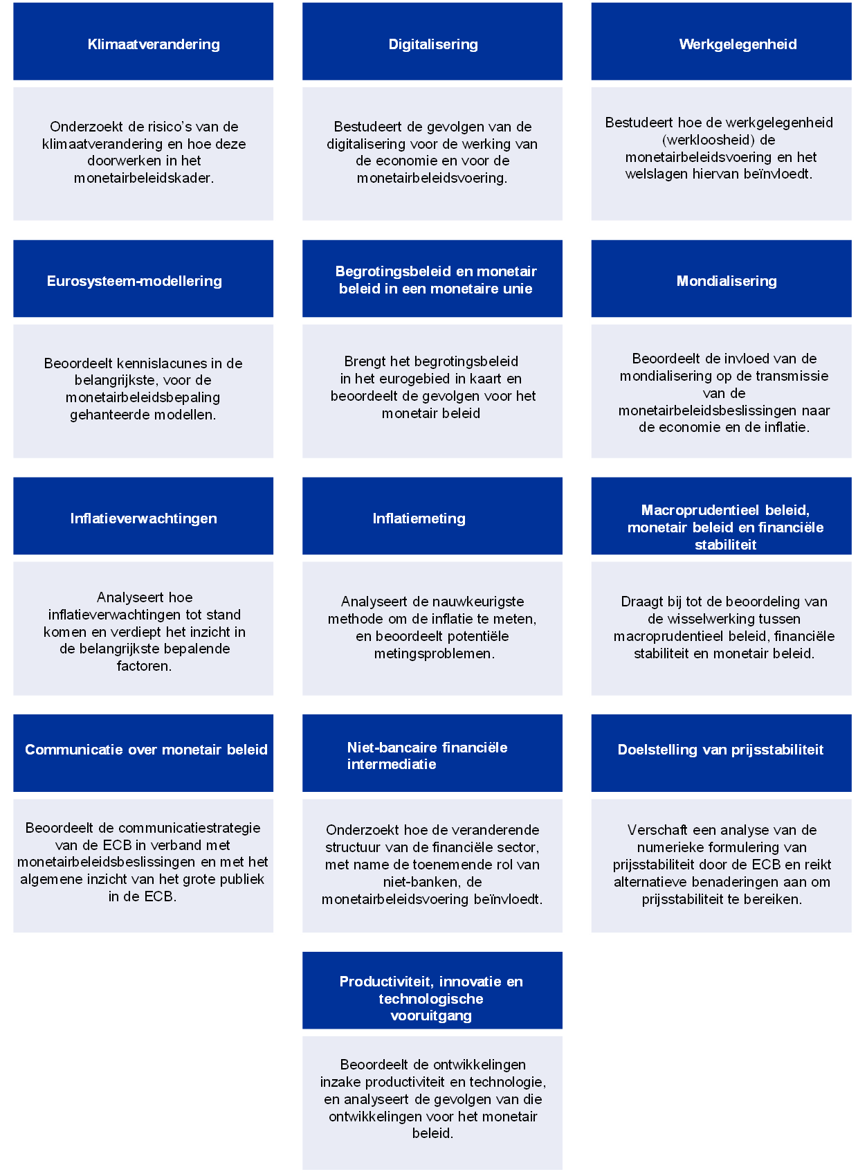 Om ervoor te zorgen dat het monetair beleid aan zijn doel blijft beantwoorden, is de Raad van Bestuur in januari een strategische evaluatie gestart. Doel van de evaluatie is een grondige analyse van de implicaties van de ingrijpende veranderingen die sinds de vorige beleidsevaluatie in 2003 hebben plaatsgevonden. Daarbij valt te denken aan de hardnekkig lage inflatie en evenwichtsrente en aan de gevolgen van globalisering, digitalisering en klimaatverandering. De vraag bij deze evaluatie, die naar verwachting in de tweede helft van 2021 wordt afgerond, is of en hoe de ECB haar monetairbeleidsstrategie daaraan moet aanpassen.