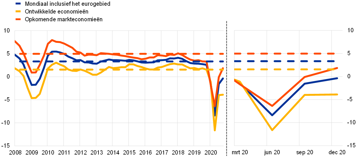 De verspreiding van de pandemie, de maatregelen om deze in te dammen en de steunpakketten om de economische gevolgen van de pandemie te verzachten waren de belangrijkste factoren die de mondiale groeiontwikkelingen bepaalden. De wereldeconomie werd geraakt door een heftige externe schok en overheden reageerden met omvangrijke steunpakketten om de economische gevolgen van de pandemie te verzachten. Als gevolg van de maatregelen om het virus tegen te houden, bereikte de wereldeconomie in het tweede kwartaal van 2020 een dieptepunt. In het derde kwartaal, toen de pandemie leek af te zwakken, de maatregelen werden versoepeld en de positieve berichten over de ontwikkeling van werkzame vaccins toenamen, begon de wereldeconomie zich weer te herstellen. In verschillende ontwikkelde economieën sloeg in het laatste kwartaal echter een tweede golf toe, waarna in die economieën opnieuw strenge beperkende maatregelen werden ingevoerd en de economische groei als gevolg daarvan weer vertraagde (zie Grafiek 1). In diverse grote opkomende markteconomieën was de economische groei in de eerste twee kwartalen van 2020 negatief, maar herstelde deze zich sterk in de tweede helft van het jaar.