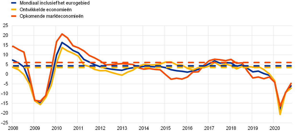 Toelichting: De groei van de wereldhandel wordt gedefinieerd als de groei van de wereldwijde invoer, met inbegrip van het eurogebied. De doorgetrokken lijnen refereren aan gegevens en lopen tot aan het vierde kwartaal van 2020. De onderbroken lijnen geven de langjarige gemiddelden aan tussen het vierde kwartaal van 1999 en het vierde kwartaal van 2020. De meest recente waarnemingen betreffen 25 februari 2021.