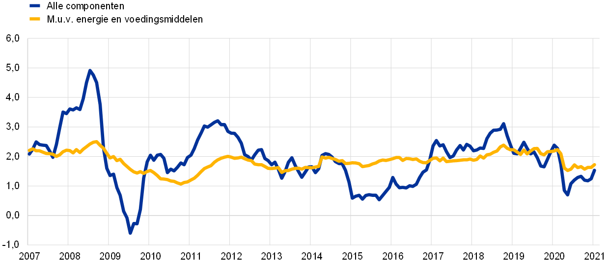 - Zie voor een uiteenzetting over de problemen bij het meten van consumptieprijzen tijdens de pandemie het Kader “Consumption patterns and inflation measurement issues during the COVID-19 pandemic”, Economic Bulletin, Issue 7, ECB, 2020.