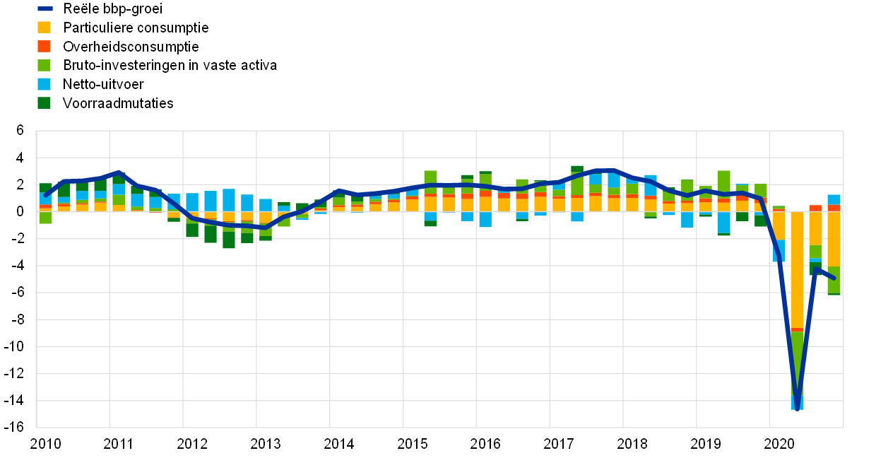 De netto bijdrage van de externe sector aan de productie in het eurogebied was eveneens negatief in 2020. De handel van de eurogebied zakte aan het begin van het jaar iets in, toen China in lockdown ging om de verspreiding van COVID-19 een halt toe te roepen. In het tweede kwartaal leidden de maatregelen om het virus in te dammen in Europa tot een terugval van zowel de invoer als de uitvoer, waarbij die laatste het zwaarst getroffen werd door de tijdelijke opschorting van bedrijfsactiviteiten. De versoepeling van de maatregelen in de zomer zorgde voor een heropleving van de handelsstromen, waarbij de sectoren die het hardst geraakt waren, zoals reizen, toerisme en horeca, in verhouding weinig verbetering lieten zien. De heropleving van de pandemie vertraagde het herstel in het eurogebied, dat niet volledig was aan het eind van het jaar.