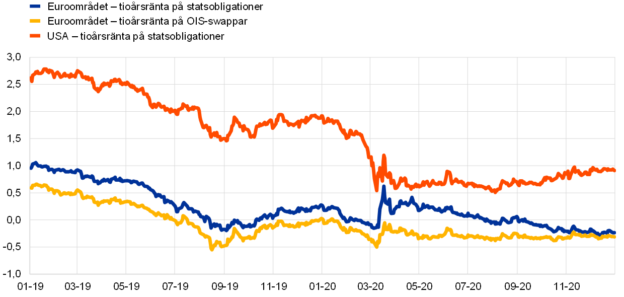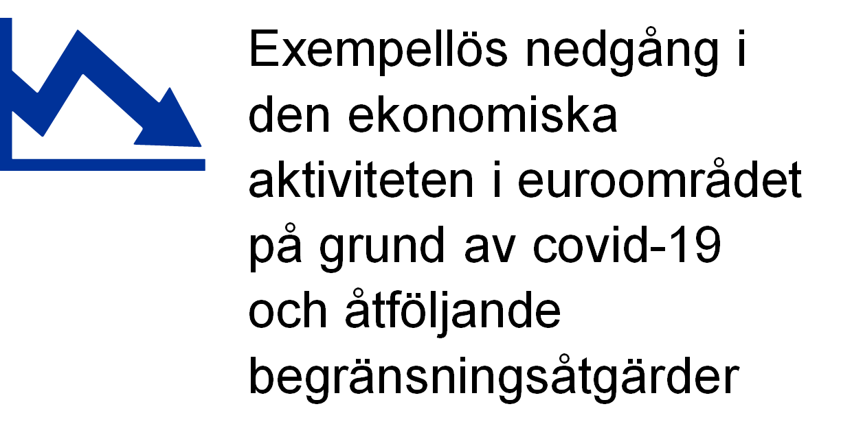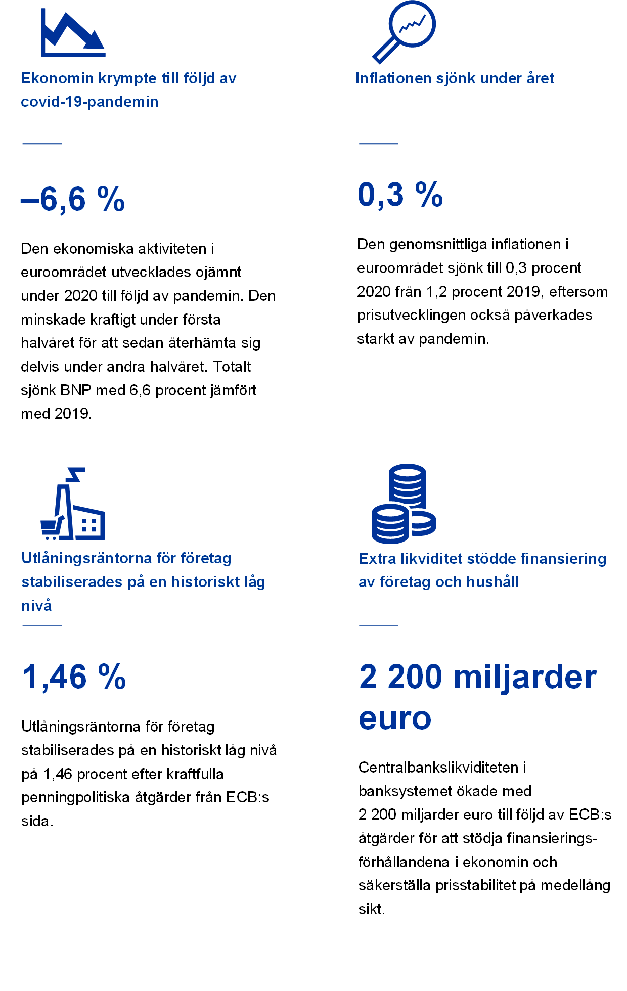 Ekonomin i euroområdet drabbades under 2020 av en extraordinär och allvarlig chock från coronaviruspandemin (covid-19). Den ekonomiska aktiviteten minskade kraftigt under det första halvåret till följd av nedstängningsåtgärder och ökad riskaversion. Den kraftfulla och koordinerade penning- och finanspolitiska responsen, i kombination med positiva nyheter om vaccin, bidrog till att stabilisera aktiviteten under det andra halvåret. Totalt sett sjönk BNP i euroområdet med 6,6 procent under 2020. Den årliga totala inflationen sjönk till 0,3 procent från 1,2 procent 2019, främst som resultat av sjunkande energipriser men även på grund av vissa faktorer relaterade till pandemin. Till exempel bidrog de sektorer som drabbades hårdast av pandemin, t.ex. rese- och hotellbranschen, till att inflationen sjönk under det andra halv året.