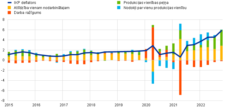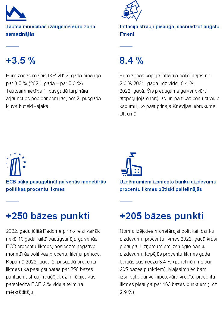 Inflācija euro zonā pieauga no 2.6 % 2021. gadā līdz 8.4 % 2022. gadā. Šis pieaugums galvenokārt atspoguļoja enerģijas un pārtikas cenu straujo kāpumu, kuru izraisīja karš Ukrainā. Agrākās piegādes problēmas un zināms atliktais pieprasījums, kas saglabājies koronavīrusa (Covid-19) pandēmijas ietekmē, kopā ar enerģijas cenu kāpuma izraisītajām augstajām ražošanas resursu izmaksām palielināja cenu spiedienu daudzās tautsaimniecības nozarēs. Pēc spēcīga 1. pusgada, kad īpaši pakalpojumu sektoru labvēlīgi ietekmēja ar pandēmiju saistīto ierobežojumu atcelšana, izaugsme euro zonā palēninājās galvenokārt Ukrainā notiekošā kara ietekmē.
