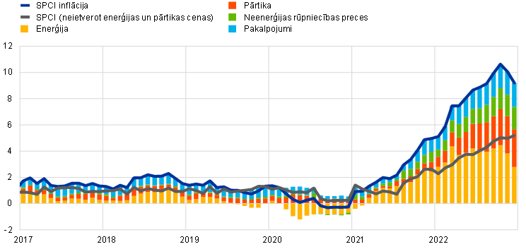 Euro zonas kopējā inflācija, ko mēra ar saskaņoto patēriņa cenu indeksu (SPCI), 2022. gadā vidēji bija 8.4 % – daudz augstāka nekā 2.6 % vidēji 2021. gadā. Inflācija strauji palielinājās visu gadu, pēdējos mēnešos sasniedzot augstu līmeni (aptuveni 10 % salīdzinājumā ar iepriekšējā gada atbilstošo periodu). Enerģijas cenas bija vissvarīgākais kopējās inflācijas kāpumu noteicošais komponents, un arī pārtikas cenas pieauga arvien straujāk, īpaši pēc Krievijas iebrukuma Ukrainā februārī. Turklāt rūpniecības preču pastāvīgās piegādes problēmas, pieprasījuma atjaunošanās pēc tam, kad tika atviegloti ar pandēmiju saistītie ierobežojumi, īpaši pakalpojumu sektorā, un euro kursa kritums pastiprināja inflācijas spiedienu (1.11. att.). Kopumā cenu spiediens skar arvien vairāk nozaru; tas ir daļēji saistīts ar augsto enerģijas izmaksu netiešo ietekmi visā tautsaimniecībā. Euro zonas valstu inflācijas līmeņu atšķirības arī būtiski palielinājās, lielākoties atspoguļojot izejvielu un enerģijas cenu izraisīto šoku atšķirīgo ietekmi. Vairākums pamatinflācijas rādītāju gada laikā būtiski pieauga. 2022. gada beigās tika gaidīts, ka faktori, kas noteica inflācijas straujo kāpumu, izzudīs un inflācija 2023. gada laikā mazināsies.
