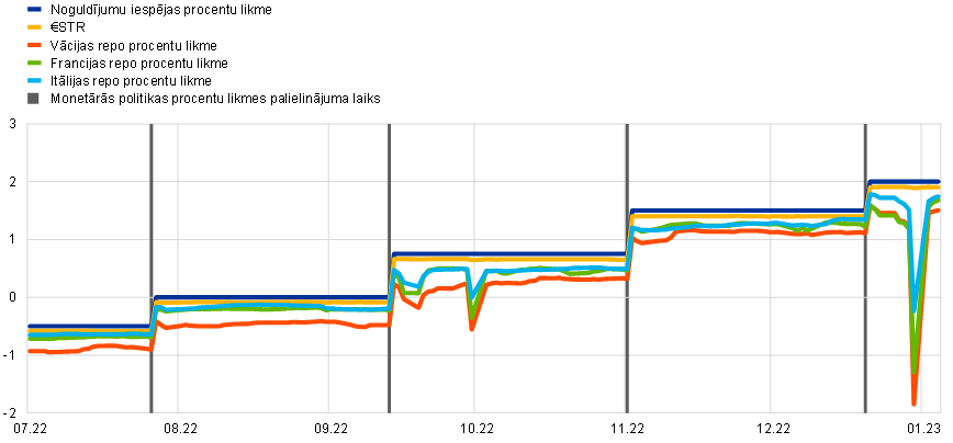Tāpēc decembrī pēc gada pēdējās monetārās politikas sanāksmes mēs paziņojām, ka procentu likmes joprojām vajadzētu būtiski paaugstināt stabilā tempā, lai sasniegtu līmeni, kas ir pietiekami ierobežojošs, lai nodrošinātu savlaicīgu inflācijas atgriešanos mūsu mērķrādītājam atbilstošā līmenī. Vienlaikus mēs norādījām, ka, lai gan galvenās ECB procentu likmes ir mūsu primārais monetārās politikas nostājas noteikšanas instruments, mēs ar 2023. gada martu sāksim samazināt AIP vērtspapīru portfeli mērenā un prognozējamā tempā. Pirms tam oktobrī nolēmām arī pārkalibrēt trešā ilgāka termiņa refinansēšanas mērķoperāciju kopuma noteikumus un nosacījumus, novēršot šķēršļus brīvprātīgai neatmaksāto līdzekļu pirmstermiņa atmaksai. No jūnija beigām (kad beidzās neto aktīvu iegādes) līdz decembra beigām mūsu bilancē esošie monetārās politikas aktīvi samazinājās aptuveni par 830 mljrd. euro, tam veicinot bilances normalizēšanos.