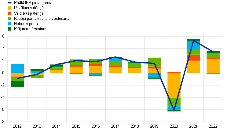 Pēc tam, kad euro zonas reālais IKP 2021. gadā bija pieaudzis par 5.3 %, 2022. gadā tas palielinājās par 3.5 %, jo tautsaimniecība atveseļojās no recesijas, kas bija saistīta ar pandēmiju (1.3. att.). Izaugsme 2022. gadā galvenokārt atspoguļoja stabilu iekšzemes pieprasījuma devumu. Līdz gada beigām izlaide euro zonā par 2.4 % pārsniedza līmeni, kāds bija pirms pandēmijas, t. i., salīdzinājumā ar 2019. gada 4. ceturksni. Tomēr izaugsmes rādītāji dažādās valstīs būtiski atšķīrās, atspoguļojot atšķirīgās ekonomiskās struktūras un to, cik lielā mērā atsevišķas valstis guva labumu no pakalpojumu nozares atkalatvēršanās un cik lielā mērā tās ietekmēja Krievijas iebrukums Ukrainā. Tā kā 1. pusgadā vērojamā spēcīgā kontaktintensīvo pakalpojumu pieprasījuma atjaunošanās zaudēja sparu, enerģijas cenu kāpums sāka mazināt izdevumus un ražošanu visā tautsaimniecībā. Euro zonā bija jūtama arī globālā pieprasījuma vājināšanās un daudzās lielākajās tautsaimniecībās noteiktās ierobežojošākās monetārās politikas ietekme augstas ekonomiskās nenoteiktības un uzņēmumu, kā arī mājsaimniecību konfidences krituma apstākļos.