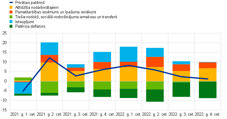 Privātā patēriņa pieaugums 2022. gadā bija noturīgs, jo darba ienākumi saglabājās stabili un ietaupījumi veicināja atlikto pieprasījumu (1.4. att.). Pozitīvā dinamika balstījās galvenokārt uz pakalpojumu patēriņu, kas krasi pieauga pēc to ierobežojumu atcelšanas, kuri bija noteikti saistībā ar pandēmiju. Tomēr privātā patēriņa izaugsme gada gaitā palēninājās. To noteica mazie izdevumi par īslaicīga lietojuma precēm reālo rīcībā esošo ienākumu kāpuma samazināšanās un ieilgušās nenoteiktības apstākļos. Kopumā mājsaimniecību izdevumi 2022. gadā palielinājās par 4.3 %. Spēcīgā nodarbinātības kāpuma un darba samaksas pakāpeniskās palielināšanās apstākļos rīcībā esošo ienākumu pieaugumu 2022. gadā galvenokārt noteica darba ienākumi, ko patēriņa jomā parasti izmanto vairāk nekā citus ienākumu avotus. Tomēr gada beigās inflācijas palielināšanās arvien vairāk mazināja reālos rīcībā esošos ienākumus, atsverot noturīgā darba tirgus un fiskālā atbalsta labvēlīgo ietekmi.