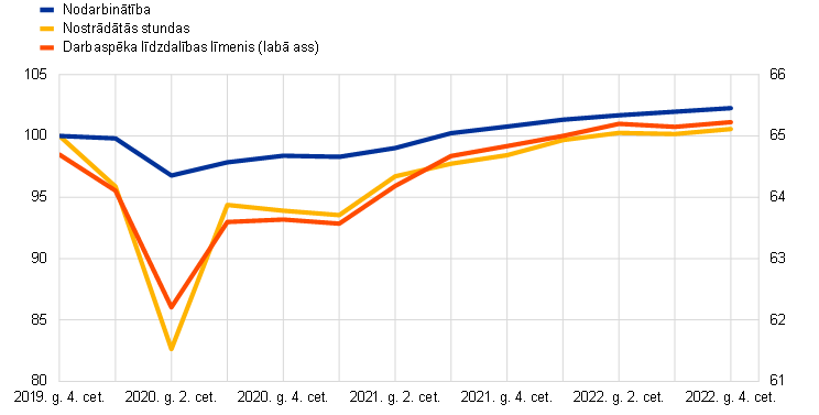 Līdz ar euro zonas ekonomiskās aktivitātes atjaunošanos turpinājās darba tirgus spēcīga atveseļošanās no pandēmijas. Līdz 2022. gada 4. ceturksnim kopējā nodarbinātība un nostrādāto stundu kopskaits bija pārsnieguši 2019. gada 4. ceturkšņa līmeni attiecīgi par 2.3 % un 0.6 % (1.6. att.). Darbaspēka līdzdalības līmenis 15–74 gadu vecuma grupā 2022. gada 4. ceturksnī palielinājās līdz 65.2 % un bija par 0.5 procentu punktiem augstāks nekā 2019. gada 4. ceturksnī. Atbilstoši nodarbinātības kāpumam bezdarba līmenis turpināja samazināties: no 6.9 % 2022. gada janvārī (jau vēsturiski zema līmeņa) līdz 6.7 % 2022. gada beigās (1.7. att.). Samazinājās darbvietu saglabāšanas shēmu izmantošana. Krīzes laikā ar tām ierobežoja atlaišanu no darba, un darba ņēmēji saskaņā ar šādām shēmām lielā mērā atsāka strādāt savu parasto darba laiku.